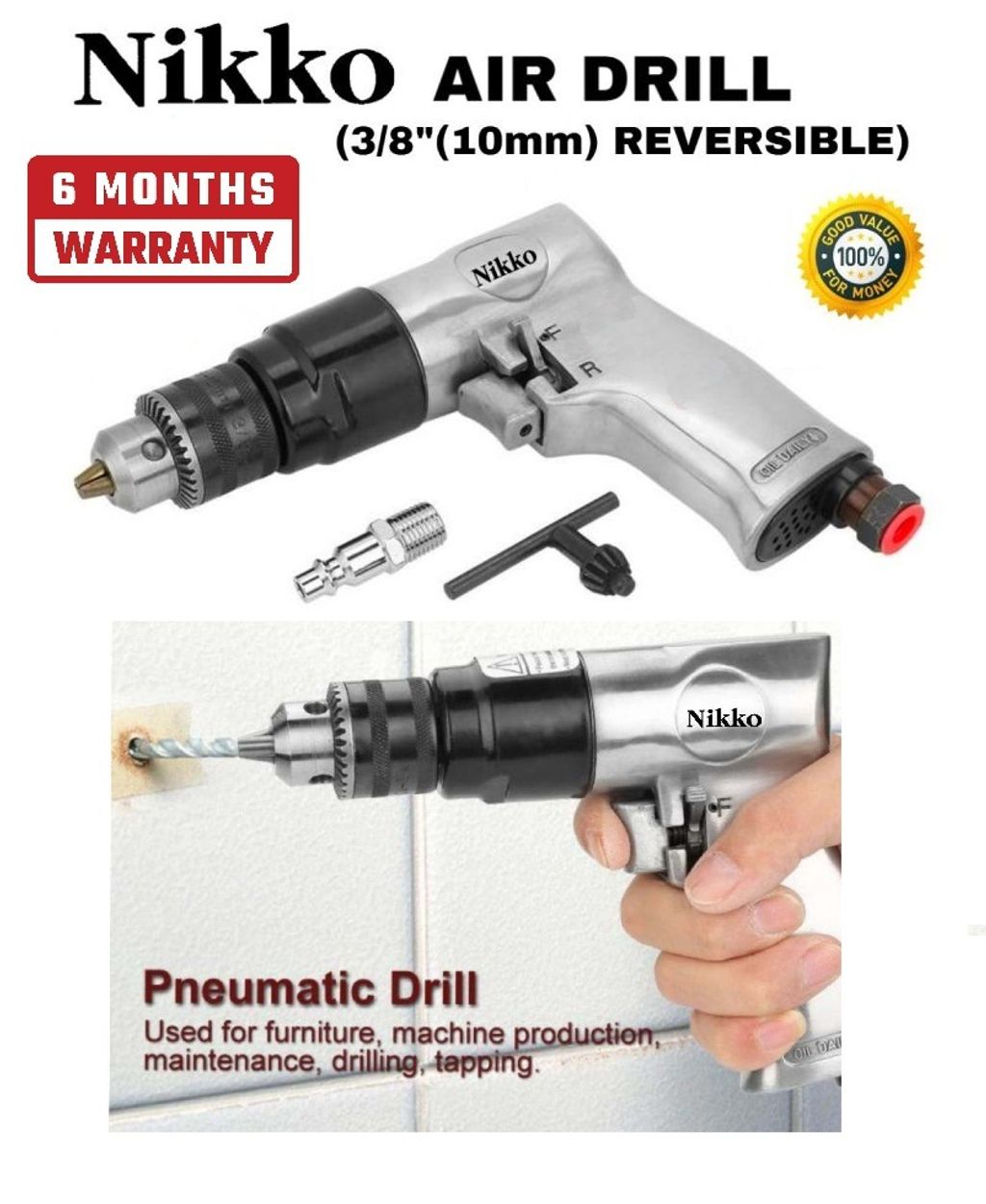 The Nikko 3/8-Inch Reversible Air drill is perfect for drilling, honing, reaming, and fastening. A thumb operated switch lets you easily reverse direction without removing your hand from the tool. Exhaust is vented back out the handle and away from your face and work project. The 3/8-inch keyed chuck can use a wide variety of bits and drivers to fulfill a wide range of roles.