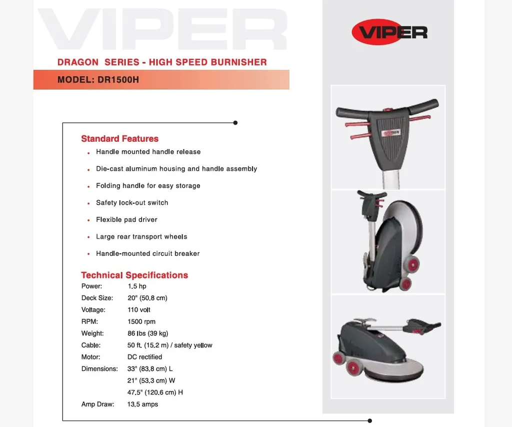 The VIPER DR1500H is a Ultra High Speed (UHS) burnisher designed to cover large areas with less maintenance costs. It is used for longlasting shine to hard floors. Simple and easy to use controls.
