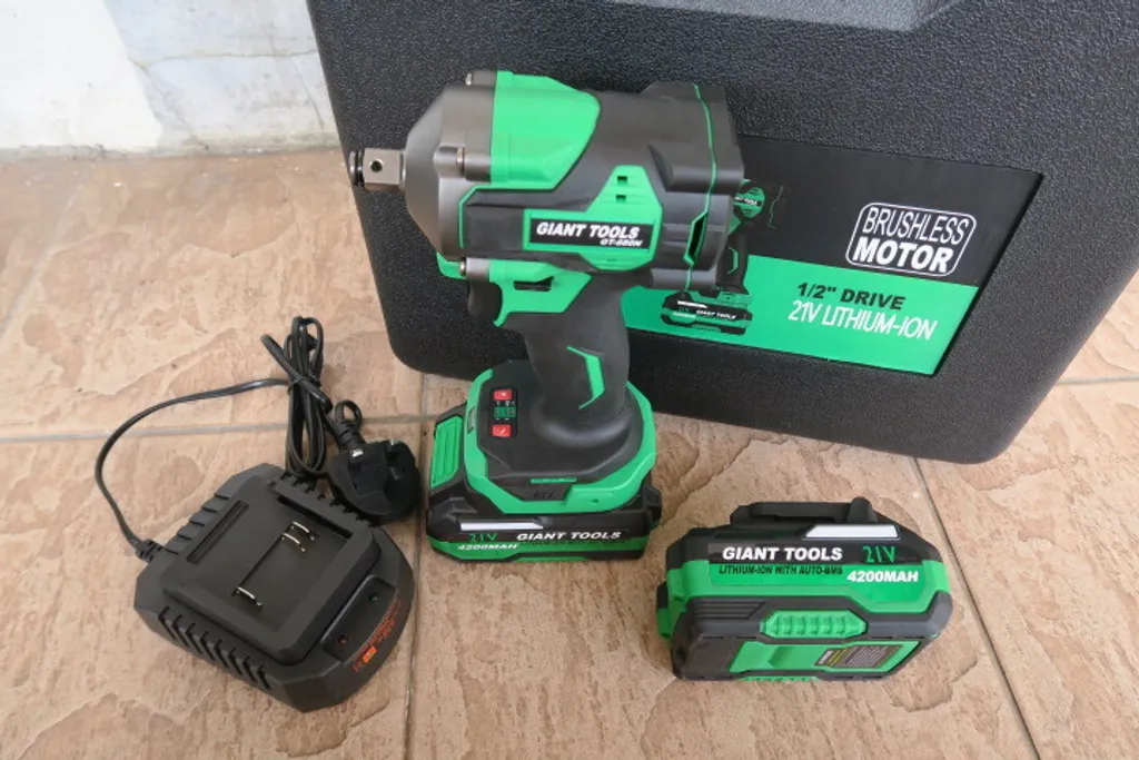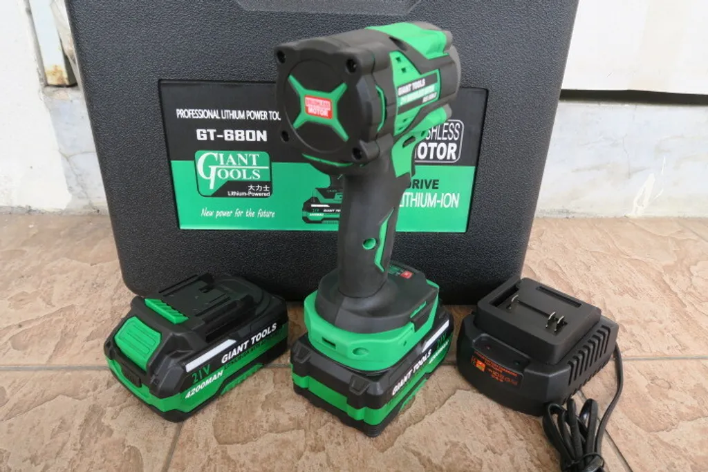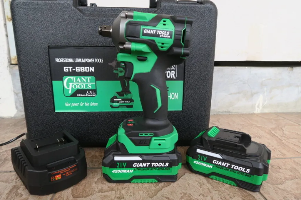 The Giant Tools GT-680N mini impact wrench features brushless motor technology. It boasts 680Nm Nut busting torque at 3,500ipm, with 3-mode selections (2 speeds + auto stop). The Intelligent power supply prevents battery overload, overheating, and excessive discharge, ensuring maximum performance, and protecting the wrench.