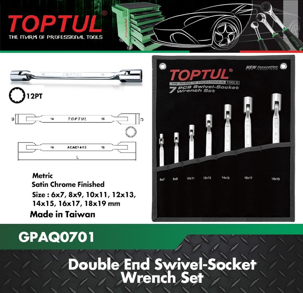 TOPTUL The Mark of Professional Tools has been dedicated to providing dependable, long-lasting Double End Swivel-Socket Wrench Set - POUCH BAG - BLACK for use throughout the Taiwan and worldwide. Our first responsibility is to completely satisfy the needs of the people and organizations that use and distribute our products, while providing best value solutions for their Double End Swivel-Socket Wrench Set - POUCH BAG - BLACK requirements.