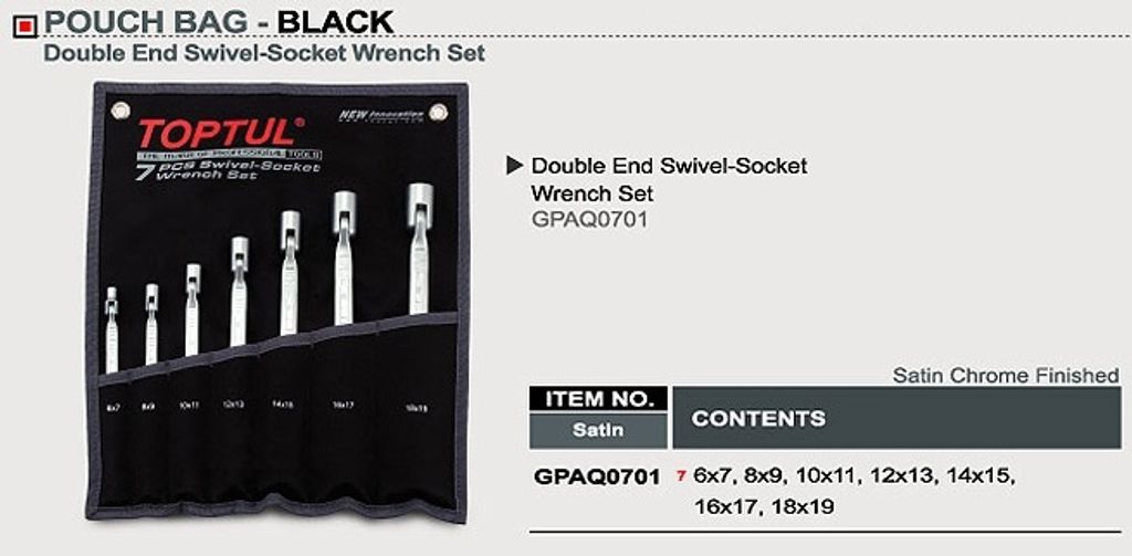 TOPTUL The Mark of Professional Tools has been dedicated to providing dependable, long-lasting Double End Swivel-Socket Wrench Set - POUCH BAG - BLACK for use throughout the Taiwan and worldwide. Our first responsibility is to completely satisfy the needs of the people and organizations that use and distribute our products, while providing best value solutions for their Double End Swivel-Socket Wrench Set - POUCH BAG - BLACK requirements.