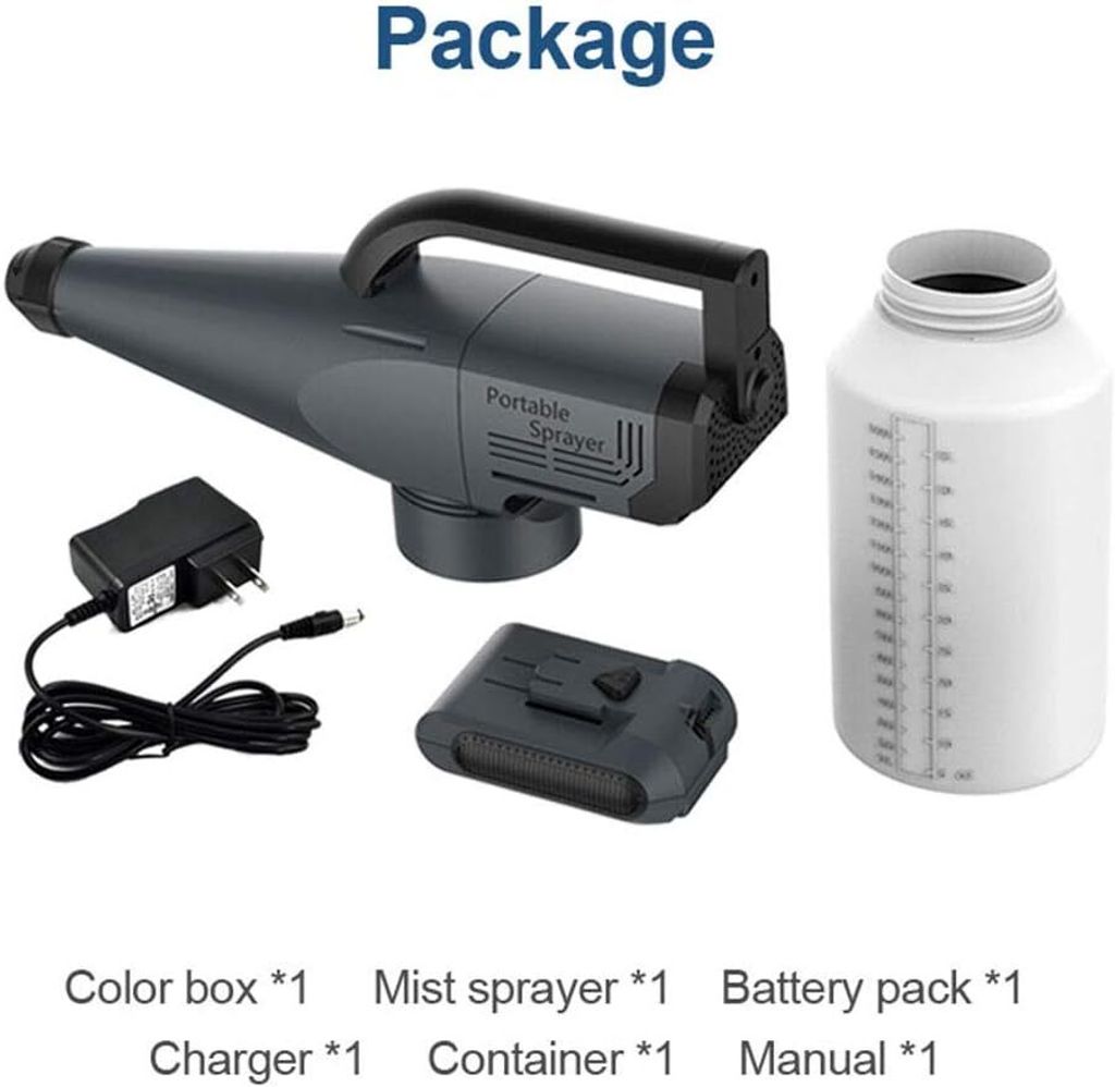 • The Electric Spray gun comes with a 100W motor, negative ion generator built inside, 1.8L bottle, 1 - 20V rechargeable battery, and a charger