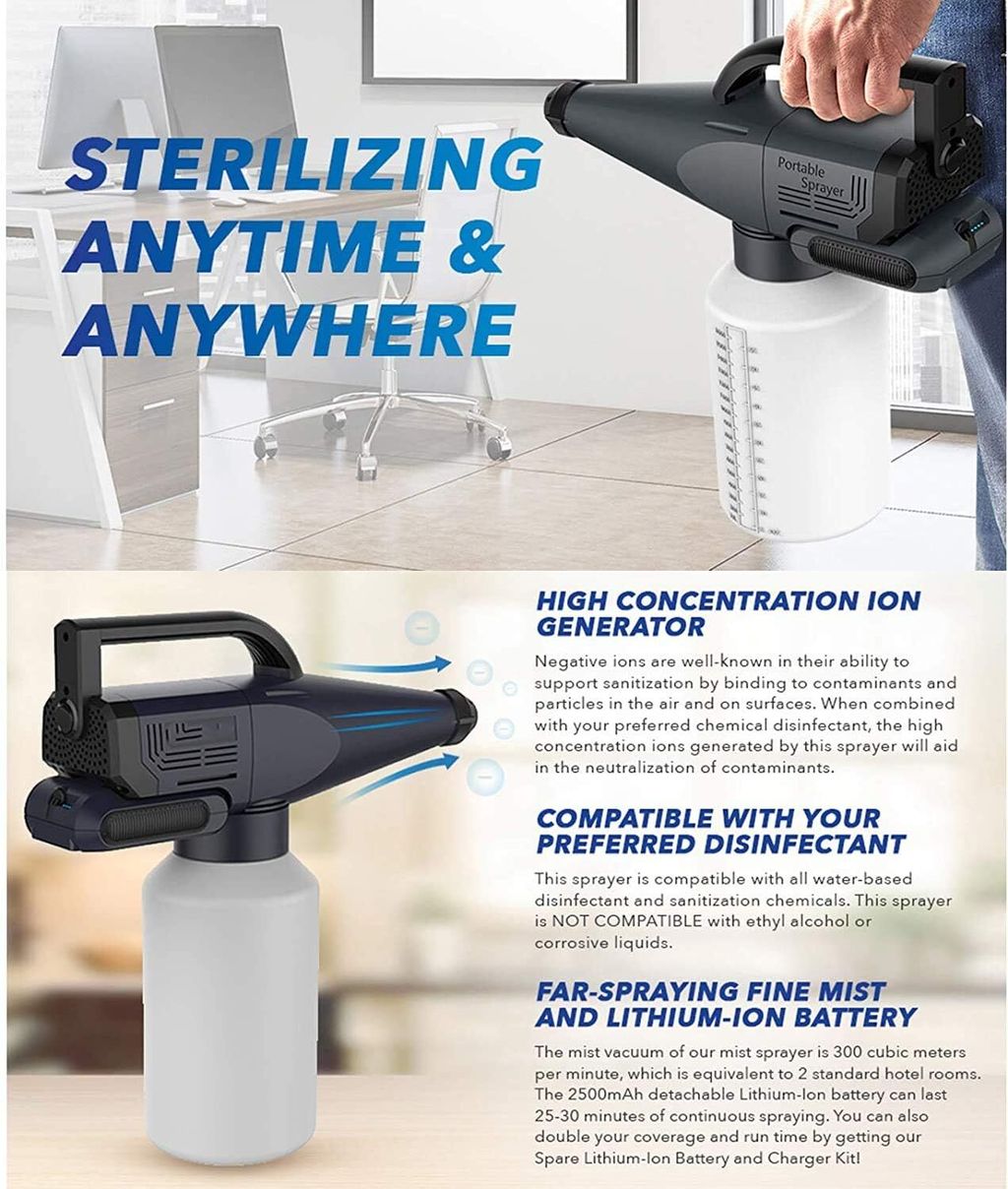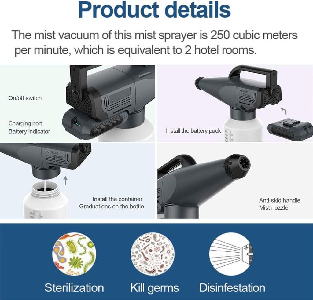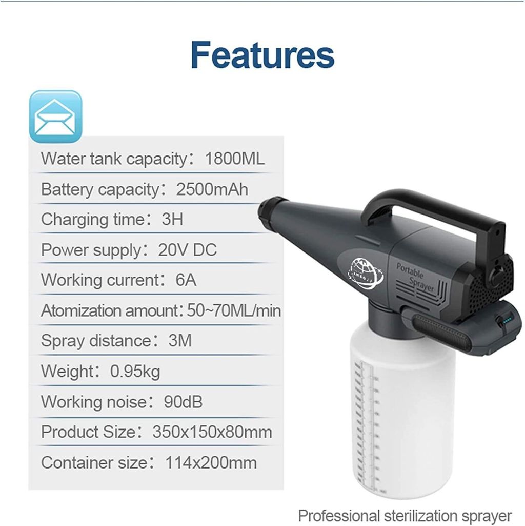 • Spraying distance: 5 meters (~16 feet). Super strong atomization effect, will not miss any corner