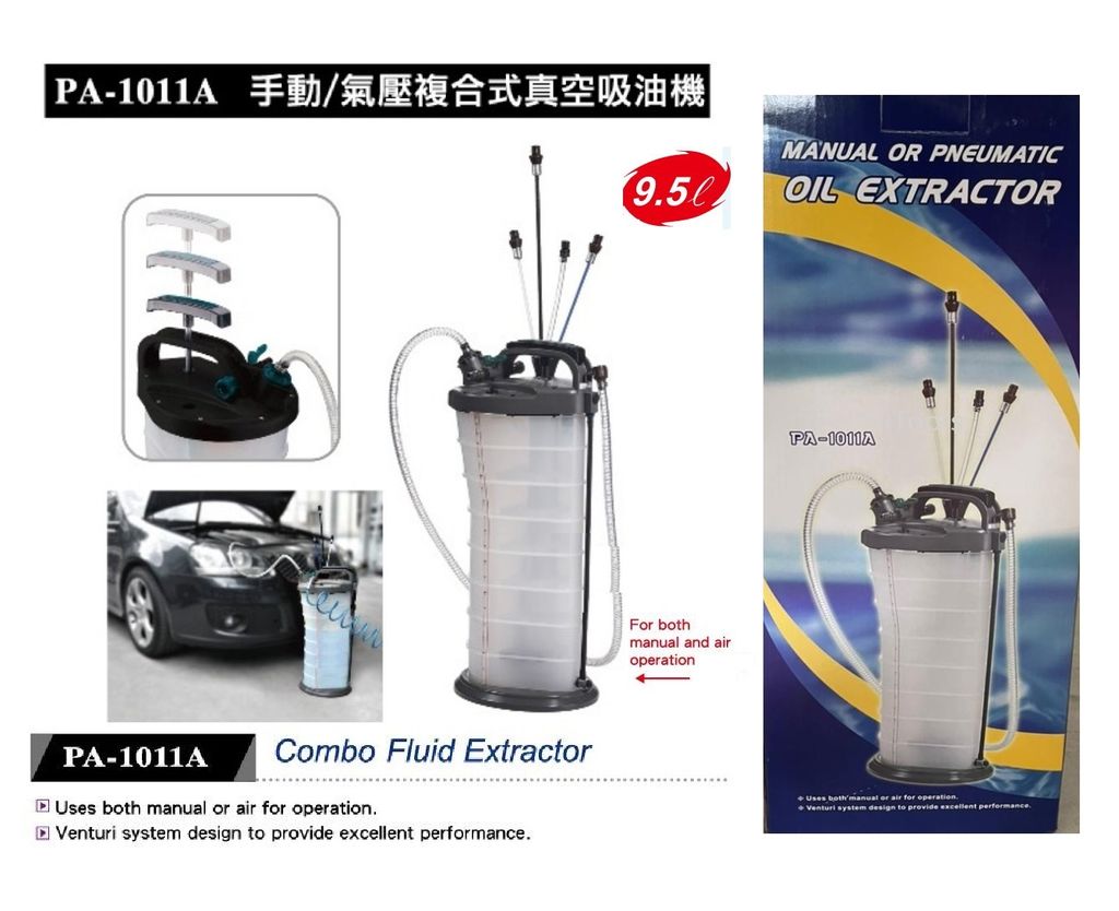New Taiwan 9.5 litre hand or pneumatic fluid pump for extracting engine oil, brake fluid, coolant, transmission oil etc. Just connect your air line to the pump, insert the hose extension into place for extraction of fluid. Lock-on air trigger for continuous use.