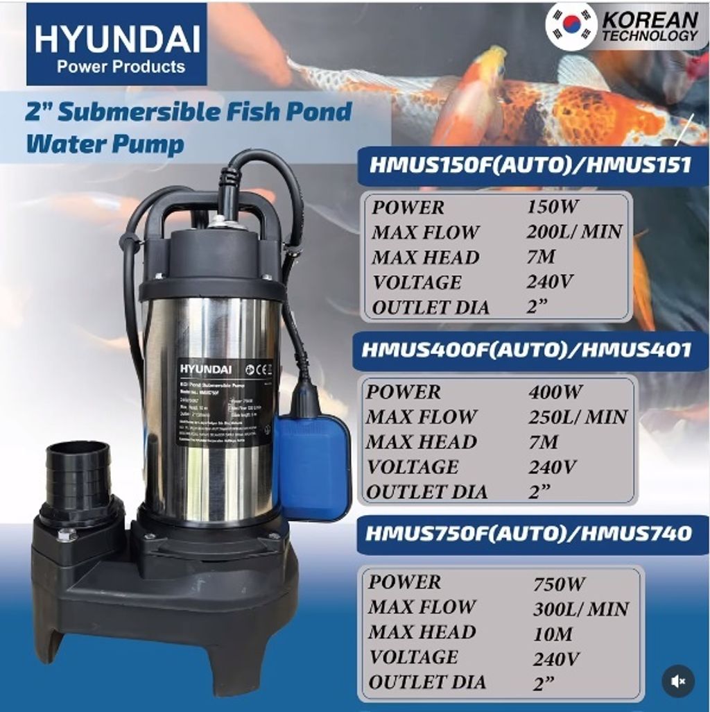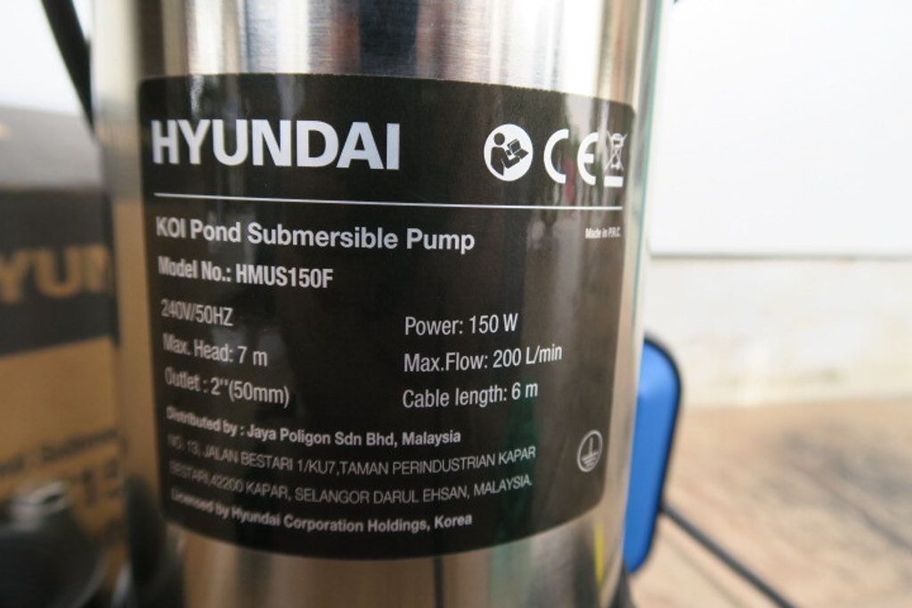 The Hyundai Koi pond submersible pump is ideal for pumping water from flooded areas, cellars, sumps etc. Pumps large soft solids in suspension. Made from tough engineering plastic and stainless steel. It also features a vortex impeller, giving up to 25mm solids handling.