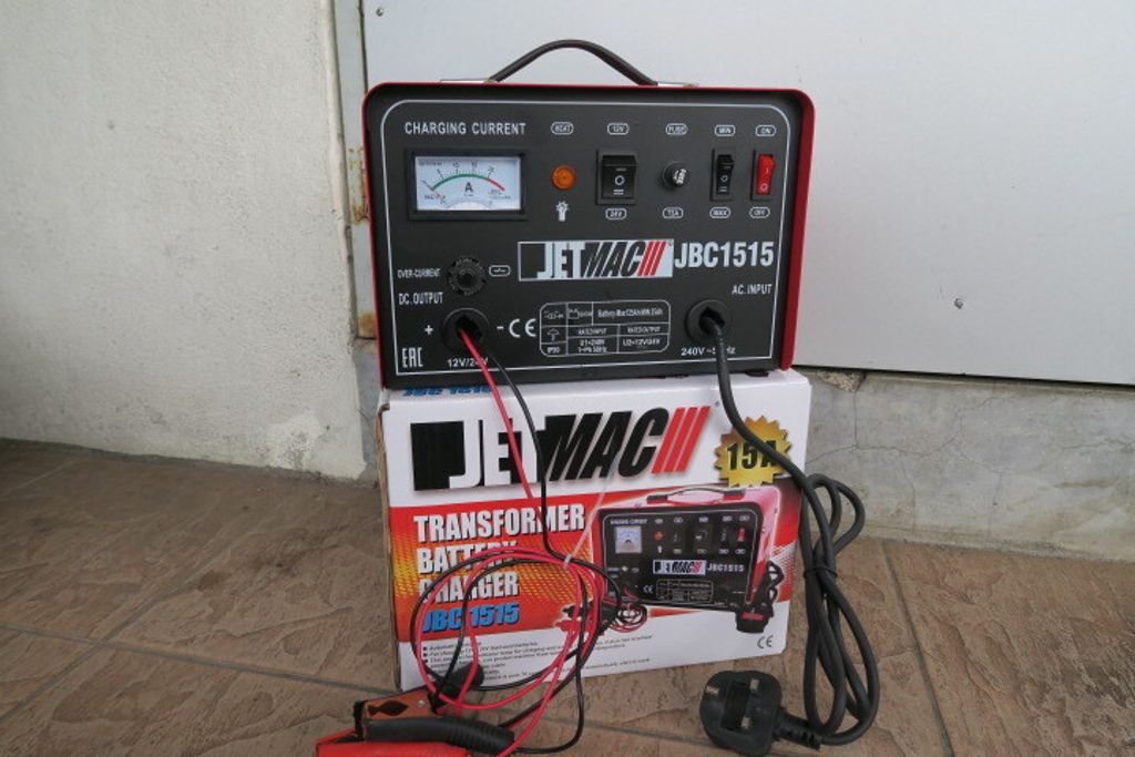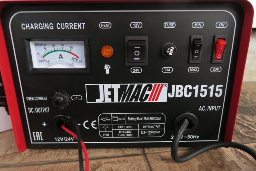 The Jetmac battery charger is in a steel case with a carry handle. It features an ammeter display to show charging rate. There are various switches of the front of the charger to control outputs to the battery such as power and voltage.