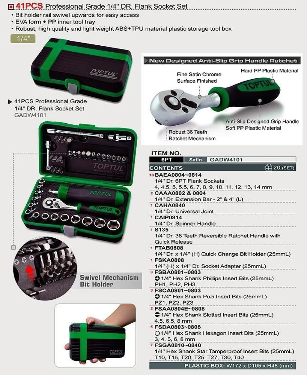 Toptul Professional 41pc x 1/4-inch DR. 6PT Flank Socket Set GADW4101..